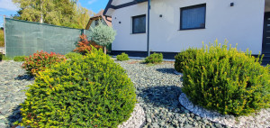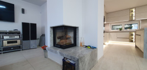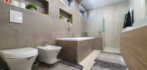220 nm élettér: nappali + 3 szoba, 3 fürdő, 3 WC, háztartásihelyiség, és egy hatalmas védett wellness és szabadidős tér. Fedett GK beállók + garázs.