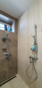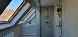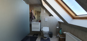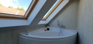 Az emeleti fürdőben kád és zuhany áll rendelkezésre, a fényt 4 db VELUX ablak biztosítja.
